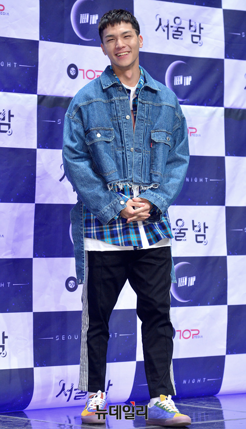 그룹 틴탑(TEENTOP : 캡, 니엘, 리키, 창조, 천지) 캡이 8일 오후 서울 강남구 SAC 아트홀에서 열린 여덟 번째 미니앨범 '서울나이트(SEOUL NIGHT)' 발매 기념 쇼케이스에 참석해 포즈를 취하고 있다.서울나이트는 용감한형제와 함께 작업한 앨범으로 서울의 밤과 그 속에 살고 있는 청춘들의 모습을 담았다. 타이틀곡 '서울밤' 포함 6곡이 수록됐다.'서울밤'은 중독성 강한 멜로디와 경쾌한 축제 분위기를 담았다. 음원은 오늘(8일) 오후 6시 공개된다.