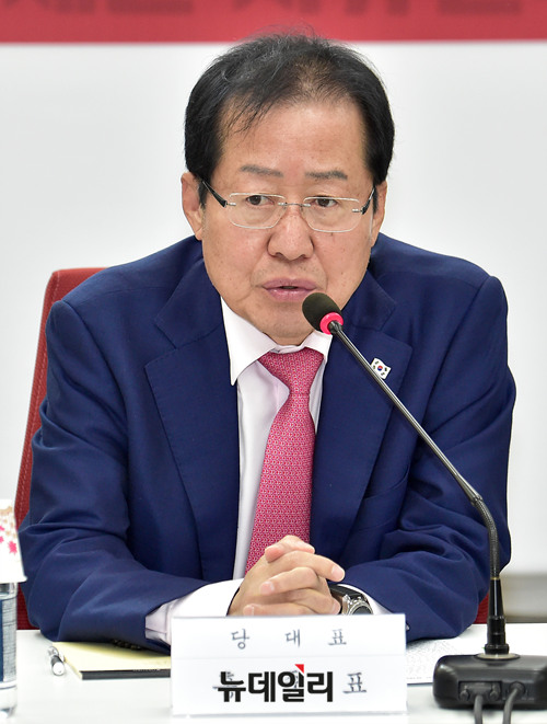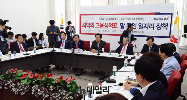 홍준표 자유한국당대표가 9일 오전 국회 당대표실에서 열린 '문재인 정부 1년, 긴급 정책 진단 토론회'에서 모두 발언을 하고 있다.