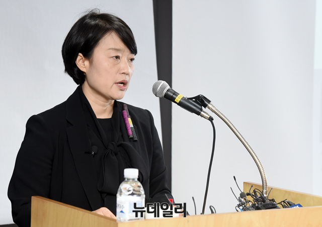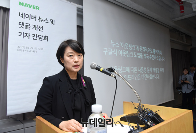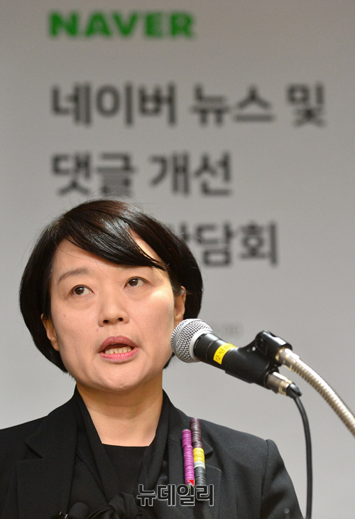 한성숙 네이버 대표가 9일 오전 서울 강남구 네이버 파트너스퀘어 역삼에서 열린 뉴스 댓글 조작 사건 관련 기자회견에 참석해 발언 하고 있다.