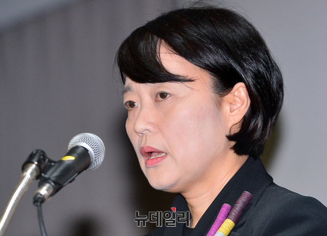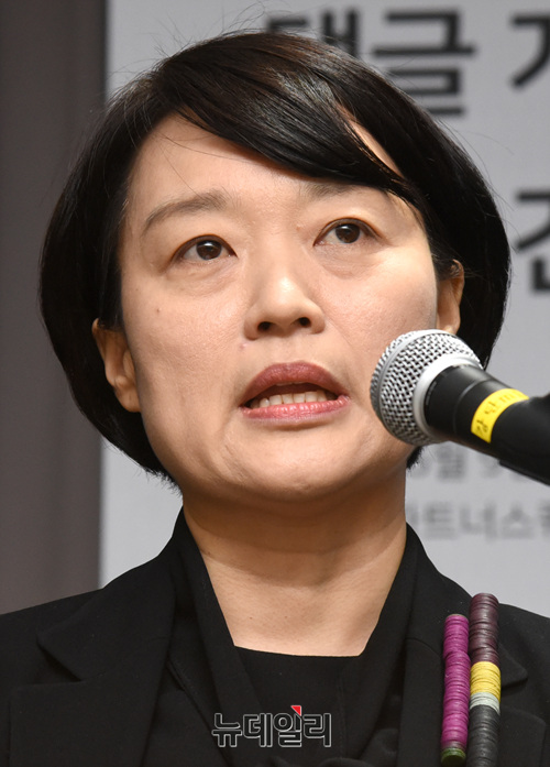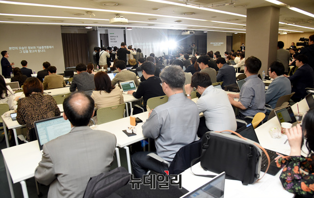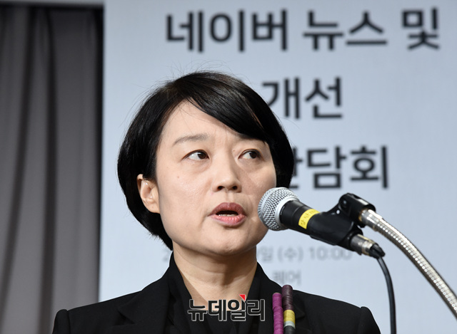 한성숙 네이버 대표가 9일 오전 서울 강남구 네이버 파트너스퀘어 역삼에서 열린 뉴스 댓글 조작 사건 관련 기자회견에 참석해 발언 하고 있다.