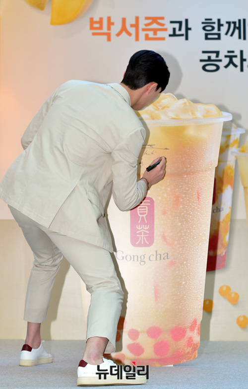 배우 박서준이 9일 오후 서울 영등포구 IFC몰 노스아트리움에서 열린 '박서준과 함께 하는 공차의 맛있는 데이트'행사에 참석해 사인 후 포즈를 취하고 있다.