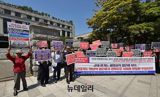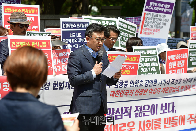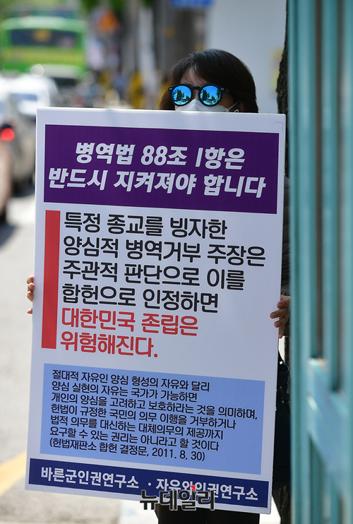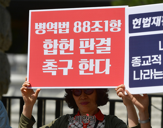 병역법 88조 1항에 대해 합헌판결을 촉구하는 시민이 9일 오전 서울 종로구 헌법재판소 앞에서 양심적 병역거부를 규탄하는 기자회견에서 '합헌 판결'을 촉구하는 손피켓을 들고 있다.바른군인권연구소와 자유인권연구소가 주최한 이날 기자회견서 "특정 종교를 빙자한 '양심적 병역거부' 주장을 합헌으로 인정하면 대한민국 존립이 위험해진다"고 주장했다.헌법재판소는 병역법 제88조 1항의 위헌 여부를 가리는 3번째 심판을 앞두고 있다. 병역법 제88조 1항은 다음과 같다.제88조(입영의 기피 등) ① 현역입영 또는 소집 통지서(모집에 의한 입영 통지서를 포함한다)를 받은 사람이 정당한 사유 없이 입영일이나 소집일부터 다음 각 호의 기간이 지나도 입영하지 아니하거나 소집에 응하지 아니한 경우에는 3년 이하의 징역에 처한다. 다만, 제53조제2항에 따라 전시근로소집에 대비한 점검통지서를 받은 사람이 정당한 사유 없이 지정된 일시의 점검에 참석하지 아니한 경우에는 6개월 이하의 징역이나 500만원 이하의 벌금 또는 구류에 처한다.