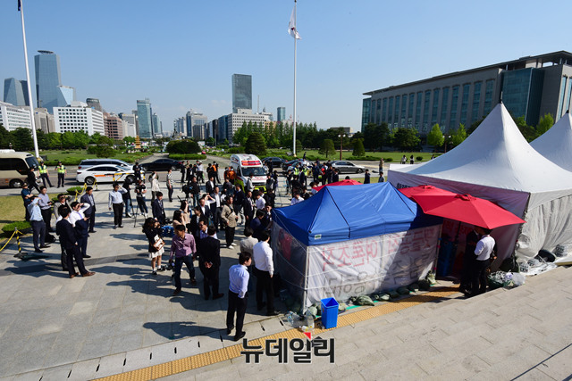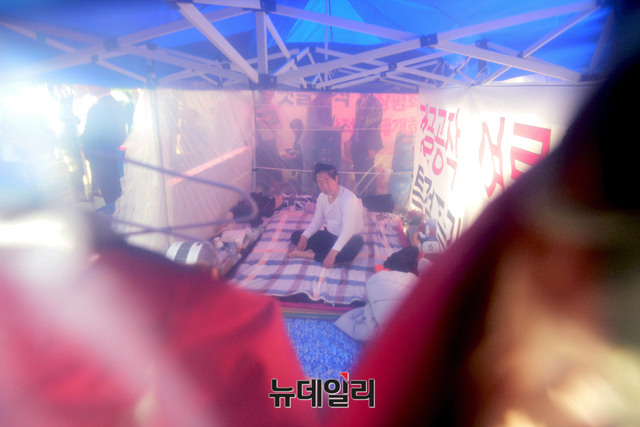 드루킹 게이트 특검을 요구하며 단식투쟁을 7일째 이어가고 있는 김성태 자유한국당 원내대표가 9일 오후 국회 단식농성장에서 의료진이 위험하다며 병원으로 가자는 권고를 거부한채 홀로 천막을 지키고 있다.