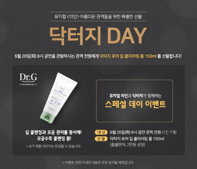 뮤지컬 '미인'이 코스메틱 브랜드 닥터지와 함께 스페셜 데이 이벤트를 펼친다한국 대중 음악의 거장 신중현의 명곡을 무대로 만날 수 있는 뮤지컬 '미인'은 10일 오후 2시 1차 티켓 오픈을 진행한다.티켓은 6월 17일부터 7월 8일까지 공연을 인터파크에서 예매할 수 있다. 인터파크 토핑 회원은 이날 오후 1시부터 선예매 가능하다.이에 제작사 홍컴퍼니는 티켓 오픈을 앞두고 6월 26일 오후 8시 공연을 관람하는 관객 전원에게 포어 딥 클리어링 폼 정품을 선물하는 '닥터지 데이' 이벤트를 실시한다.닥터지 측은 "뮤지컬 문화 이벤트는 브랜드가 소비자와 친근하게 소통할 수 있는 프로모션이다. 특히 '미인'은 '건강한 피부 미인들의 스킨멘토'라는 닥터지의 브랜드 철학과 잘 어울려 해당 이벤트를 기획했다"고 밝혔다.뮤지컬 '미인'은 '미인', '아름다운 강산', '봄비', '커피 한잔', '꽃잎', '빗속의 연인', '리듬 속에 그 춤을' 등 신중현의 23곡을 무대 위로 옮긴다. 6월 15일부터 7월 22일까지 홍익대 대학로 아트센터 대극장에서 공연된다.조기예매 30%, 마티네 30%, 문화가 있는 날 30% 등의 풍성한 혜택을 받을 수 있다.[사진=홍컴퍼니]