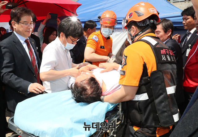드루킹 게이트 특검을 요구하며 단식투쟁을 8일째 이어가던 김성태 자유한국당 원내대표가 9일 오전 국회 단식농성장에서 급속한 건강악화로 병원으로 이송되고 있다.