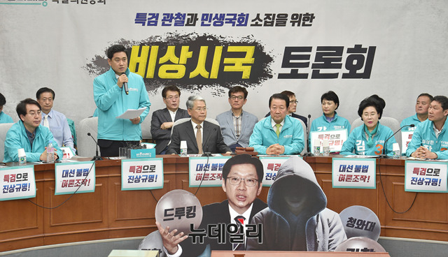 오신환 바른미래당 원내수석부대표가 10일 오후 국회에서 열린 드루킹특검 관철과 민생국회 소집을 위한 비상시국 토론회에 참석해 경과 보고를 하고 있다.