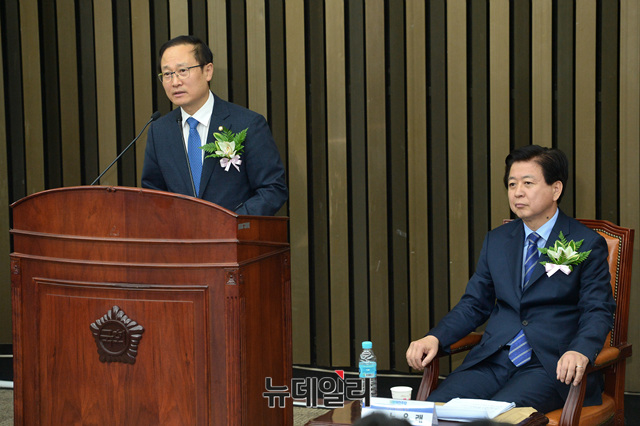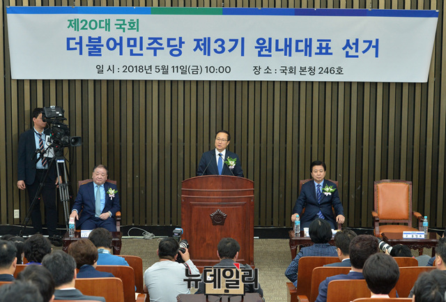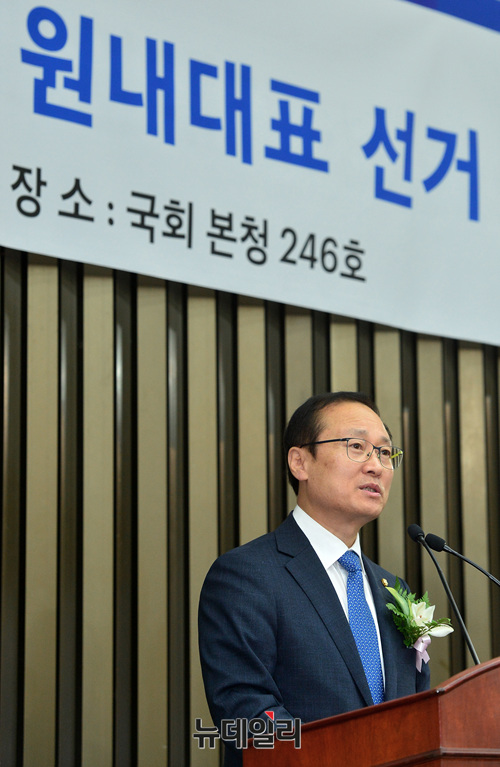 홍영표 더불어민주당 원내대표 후보가 11일 오전 국회에서 열린 '더불어민주당 신임 원내대표 선출 의원총회'에 참석해 정견발표를 하고 있다.