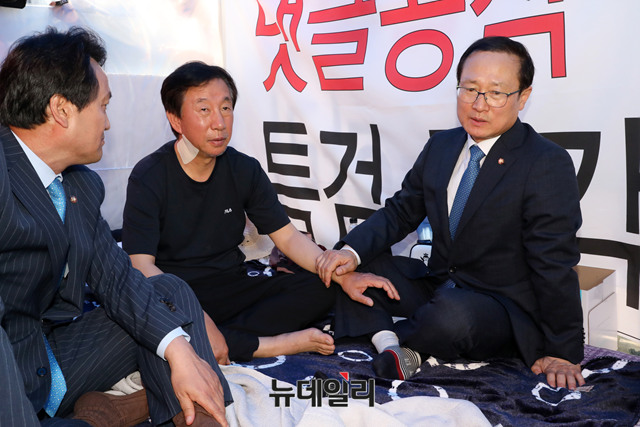 홍영표 신임 더불어민주당 원내대표가 11일 오전 국회 본청 앞에서 드루킹 댓글 조작 사건 특검을 요구하며 9일째 단식 농성을 이어가고 있는 자유한국당 김성태 원내대표를 찾아 인사하고 있다.