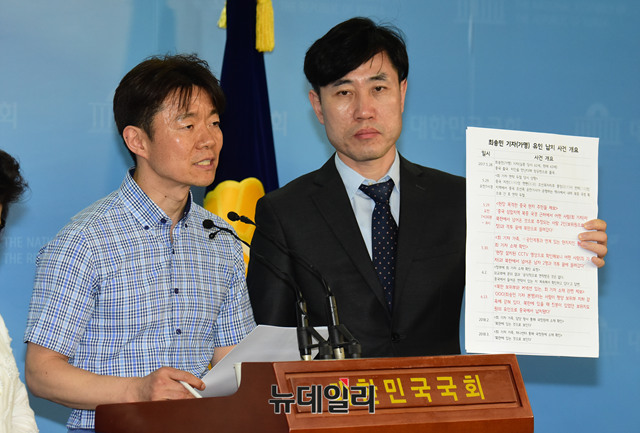 하태경 바른미래당 의원이 11일 오후 국회 정론관에서 북한전문매체인 데일리NK 소속 최송민(가명) 기자의 북한 억류 가능성을 주장하고 조속한 송환을 촉구 하고 있다. 이날 기자회견에는 최송민씨 가족 및 회사 대표가 참석했다.