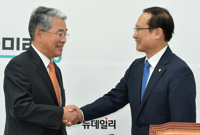 김동철 바른미래당, 홍영표 더불어민주당 신임 원내대표가 11일 오후 국회에서 악수를 나누고 있다.