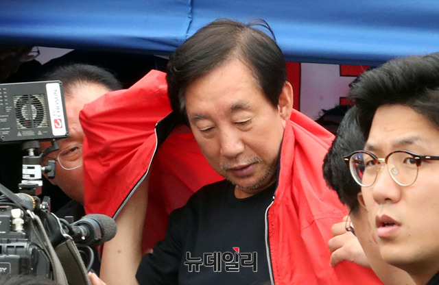 '드루킹 특검'을 촉구하며 9일째 단식농성을 이어가고 있는 김성태 자유한국당 원내대표가 11일 오후 국회에서 열린 자유한국당 의원총회에서 내린 결정으로 병원으로 향하고 있다.