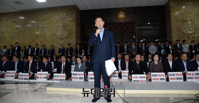 김성태 자유한국당 원내대표가 14일 오전 국회 본청 로텐더홀에서 열린 긴급 의원총회에 참석해 구호를 외치고 있다.