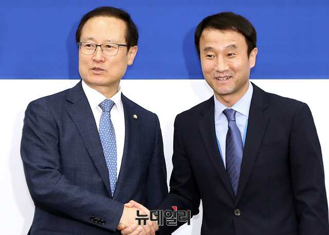 홍영표 더불어민주당 신임 원내대표가 14일 오전 국회를 예방한 한병도 청와대 정무수석과 악수를 나누고 있다.