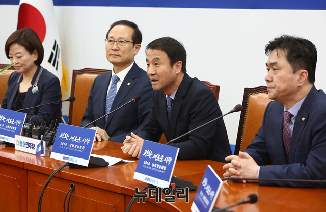 한병도 청와대 정무수석이 14일 오전 국회에서 홍영표 더불어민주당 신임 원내대표를 만나 발언하고 있다.