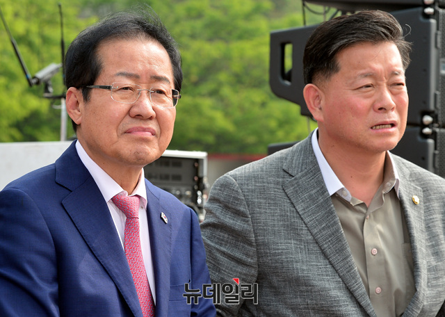 홍준표 자유한국당 대표와 김명연 의원이 14일 오후 서울 여의도공원에서 열린 '소상공인 생존권 사수 결의대회'에 참석해 대화를 나누고 있다.