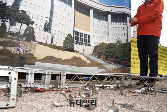 소상공인연합회 단체장들이 14일 오후 서울 여의도공원에서 열린 '소상공인 생존권 사수 결의대회'에서 국회사진에 숟가락을 던지는 퍼포먼스를 벌이고 있다.