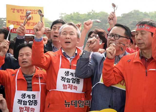 이날 소상공인들은 생계형 적합업종 특별법 즉시 처리, 소상공인 현실 반영한 최저임금 제도 개선, 카드 수수료 인하 및 단체협상권 보장 등 소상공인 5대 과제 해결을 촉구했다.