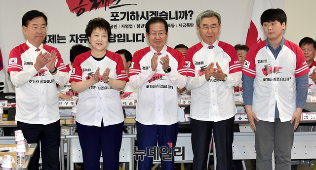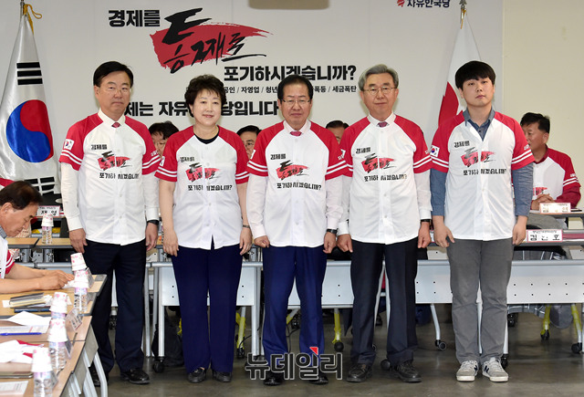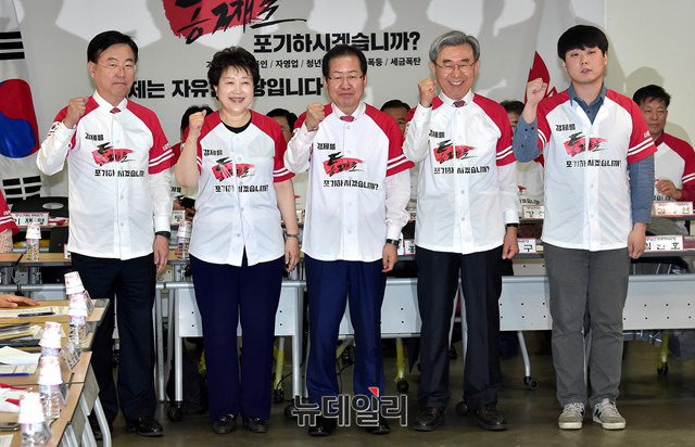 홍준표 자유한국당 대표가 15일 오전 서울 여의도 당사에서 열린 '6.13 지방선거 일자리! 설자리! 살자리! 선거대책위원회' 발대식에서 공동중앙선거대책위원장(김중석,황선혜,이용구,김인호 선거대책위원장)들과 화이팅을 외치며 기념촬영을 하고 있다.