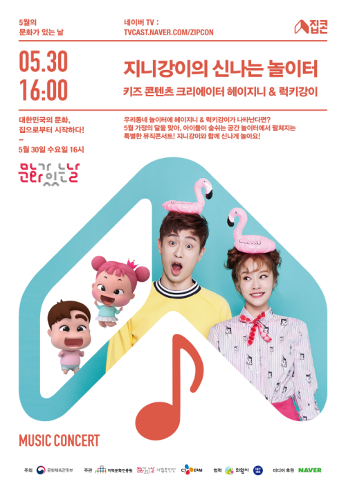 '어린이 대통령' 헤이지니&럭키강이가 5월 '집콘'의 주인공으로 나선다.5월 집콘은 가정의 달을 맞아 어린이들이 많은 시간을 보내는 동네 놀이터를 찾아간다. 오는 30일 진행되는 뮤직콘서트 ''지니강이의 신나는 놀이터'에서는 어린이들과 부모님들이 함께 즐길 수 있는 다양한 율동과 노래를 준비해 즐거운 추억을 선사할 예정이다.두 사람은 지난해 5월 유튜브에서 '헤이지니&럭키강이' 채널을 오픈한 이후 100만 구독자를 달성, 'KBS TV유치원', '코딩TV' 등의 MC를 맡았다. 최근에는 창작뮤지컬 '헤이지니&럭키강이'를 통해 어린이들과 소통하는 등 온·오프라인에서 왕성한 활동을 하고 있다.헤이지니는 "나에게 집이란 꿈을 꾸는 곳이다. 어린 시절 놀이터라는 공간은 많은 어린이들이 상상과 꿈을 펼치는 공간인 것 같다"며 "5월 집콘을 통해 어린이 친구들과 부모님들이 저희와 함께 특별한 추억을 만들고 가시면 좋겠다"며 출연 소감을 전했다.5월 집콘은 네이버 포스트 [집콘]을 통해 참여 신청을 할 수 있다. 본 행사는 30일 오후 4시부터 네이버 TV를 통해 실시간으로 방송되며, 모바일과 웹을 통해 누구나 무료로 만나볼 수 있다.지난 3월부터 2018 시즌으로 새롭게 돌아온 '집콘'은 '집에서 펼쳐지는 콘서트' 또는 '문화를 집(集)하다'라는 의미를 가졌다. 집이나 일상 공간 가까이에서 문화를 즐기자는 취지로 시작된 캠페인으로, 매달 마지막 수요일 '문화가 있는 날' 열린다.[사진=CJ E&M]