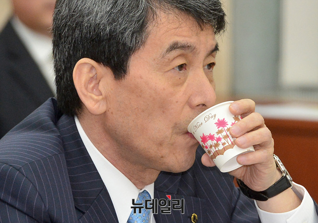 이동걸 한국산업은행 회장이 16일 오전 국회에서 열린 국회 정무위원회 전체회의에 참석해 물을 마시고 있다.
