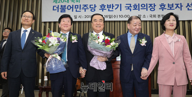 문희상 더불어민주당 의원이 16일 오전 국회에서 열린 의원총회에서 20대 국회 후반기 국회의장 후보로 선출된 후 꽃다발을 전달받고 기념사진을 촬영하고 있다.
