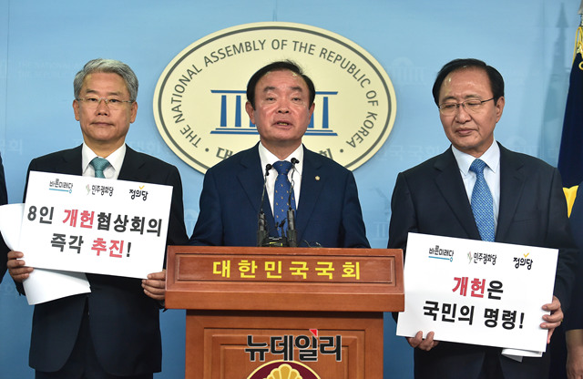 장병완 민주평화당 원내대표가 16일 오전 국회 정론관에서 열린 야3당(바른미래당, 민주평화당, 정의당) 개헌연대 기자회견에서 발언하고 있다.