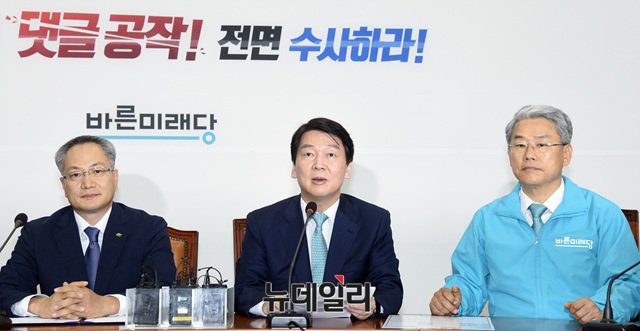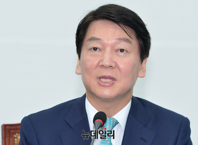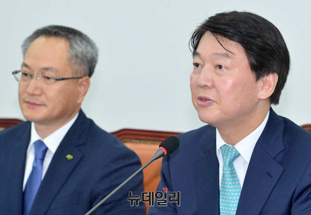 안철수 바른미래당 인재영입위원장이 16일 오후 국회에서 열린 영입인재 발표식에 참석해 전남지사 후보로 공천된 박매호 자연과미래 대표에게 환영사를 하고 있다.