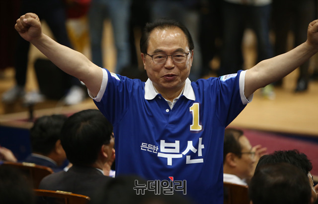 오거돈 부산시장 후보가 16일 오후 국회 의원회관에서 열린 '더불어민주당 중앙선대위 출정식 및 공천장 수여식'에서 인사하고 있다.