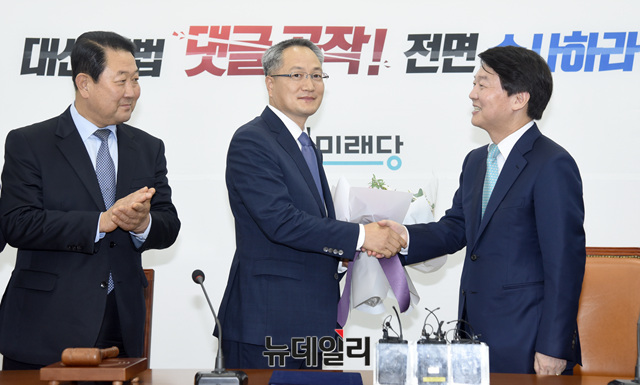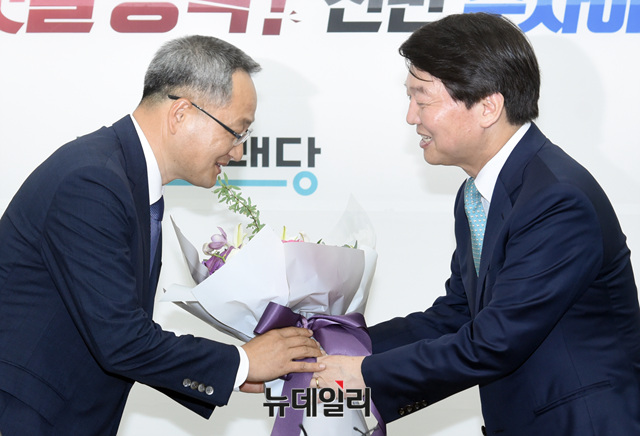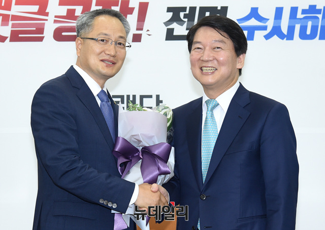 안철수 바른미래당 인재영입위원장과 박매호 전남지사 후보가 16일 오후 국회에서 열린 영입인재 발표식에 참석해 기념 촬영을 하고 있다.