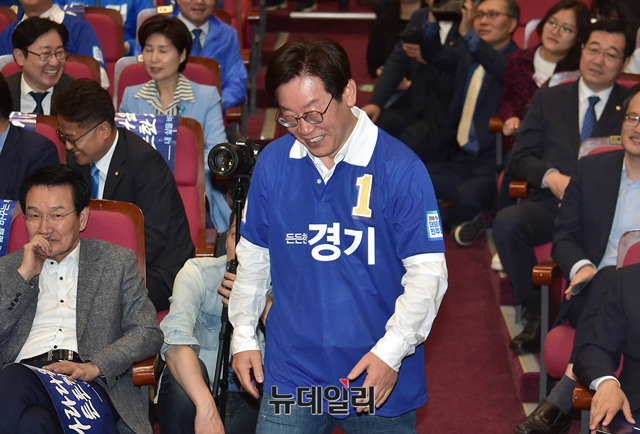 이재명 경기도지사 후보가 16일 오후 국회 의원회관에서 열린 '더불어민주당 중앙선대위 출정식 및 공천장 수여식'에서 인사하고 있다.