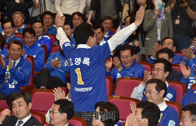 김영록 전남지사 후보가 16일 오후 국회 의원회관에서 열린 '더불어민주당 중앙선대위 출정식 및 공천장 수여식'에서 인사하고 있다.