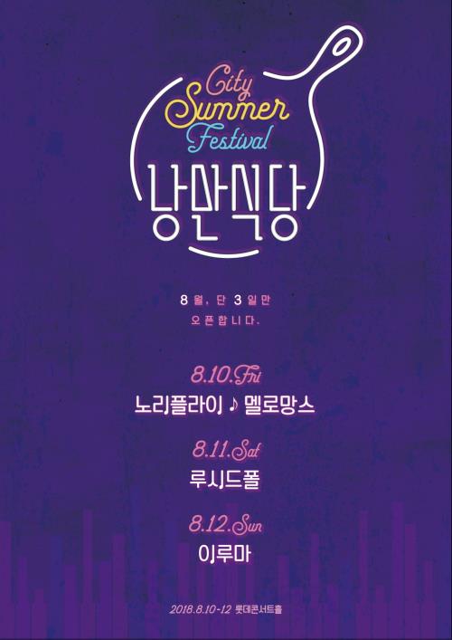 한여름 밤 특별한 식당이 문을 연다.도심 속 뮤직 페스티벌 '시티 썸머 페스티벌(City Summer Festival) – 낭만식당'(이하 '낭만식당')이 8월 10일부터 12일까지 잠실 롯데콘서트홀에서 열린다.'낭만식당'은 '멀리 떠나지 않고도 휴식과 위로를 주는 힐링 페스티벌'을 모토로 본격적인 휴가 시즌, 도심이 내려다 보이는 공연장에서 관객에게 3일간 힐링을 선사한다.8월 10일에는 노리플라이와 멜로망스가 '감성 보이스 전문 마스터 쉐프'로 관객의 감성을 살찌운다. 두 아티스트는 '따로 또 같이'의 콘셉트로 각각의 무대와 두 대의 피아노로 전하는 특별 메뉴를 선보일 예정이다.11일일 책임질 '시적 감성 전문 마스터 쉐프'는 가요계의 음유시인 루시드 폴이다. 이번 공연에서는 조윤성(피아노), 황호규(베이스), 진수킴(기타), 신동진(드럼), 파코(퍼커션)과 함께 그간 선보였던 퀸텟 구성을 기본으로 다양한 악기들을 추가해 다채로운 사운드를 들려준다.12일 마지막 날을 책임질 '감성 멜로디 전문 마스터 쉐프'는 작곡가 겸 피아니스트 이루마이다. 이루마는 'Kiss the Rain(키스 더 레인)'을 포함한 그의 대표 곡들을 김상은(바이올린)과 김상지(첼로)와 함께 하는 연주로 준비 중이다.'시티 썸머 페스티벌 – 낭만식당'은 5월 17일부터 클럽 발코니, 롯데 콘서트홀, 인터파크, 멜론티켓에서 예매할 수 있다. 오는 31일까지 구매 시 10% 할인 혜택을 제공한다.