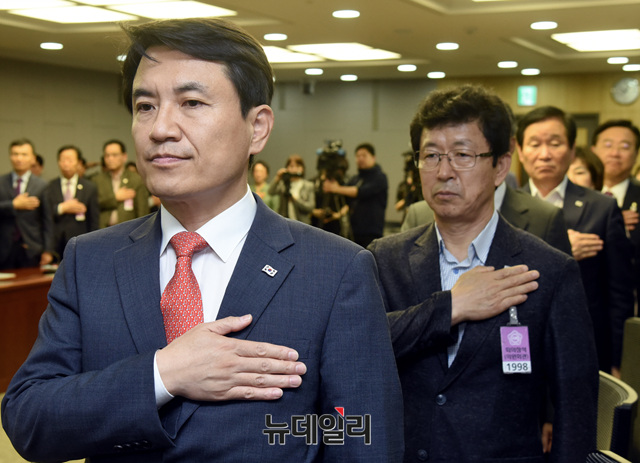 [포토] 국민의례 하는 김진태 자유한국당 의원