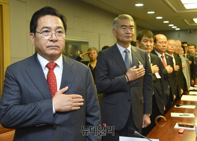 심재철 국회부의장이 18일 오전 국회 의원회관에서 열린 '탈북민 북송공세와 인권 파괴' 토론회에 참석해 국민의례를 하고 있다.