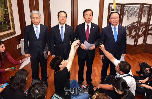 여야 교섭단체 원내대표들이 18일 오후 국회 의장실에서 '드루킹 특검법안' 세부내용의 합의문을 발표하고 있다.