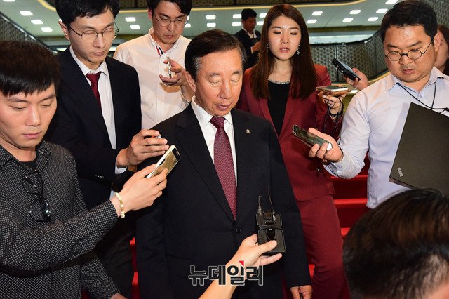 김성태 자유한국당 원내대표가 18일 오후 국회 의장실에서 '드루킹 특검법안' 세부내용의 합의문 발표 후 기자들의 질문에 답하고 있다.