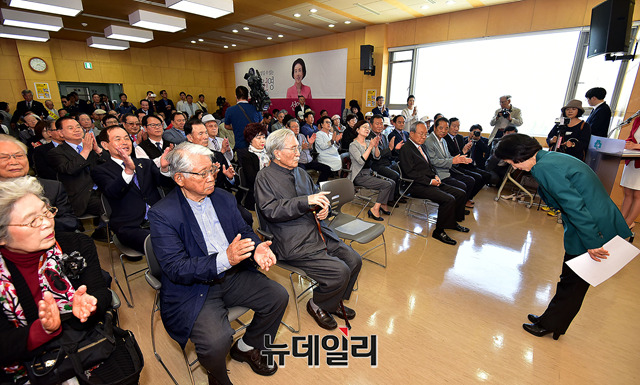 박선영 서울시교육감 후보를 비롯한 개소식 참석자들이 23일 오후 서울 종로구 안국역에 위치한 박 후보의 선거사무실 개소식에서 기념촬영을 하고 있다.