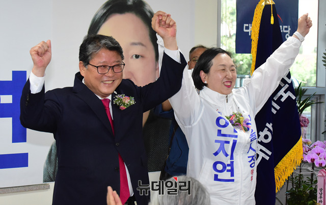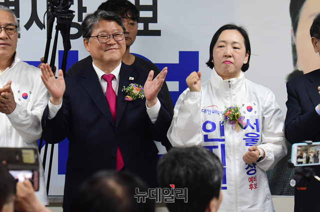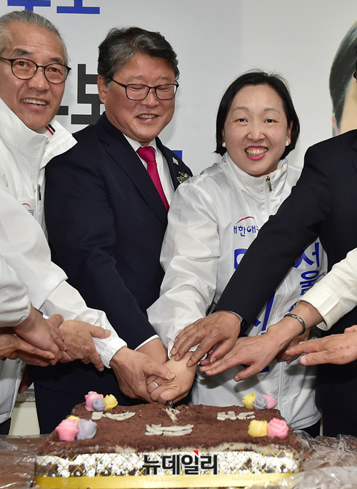 조원진 대한애국당 대표와 인지연 서울시장 후보가 23일 서울 중구 양평빌딩에서 열린 선거사무소 개소식에서 떡케익 커팅식을 갖고 있다.