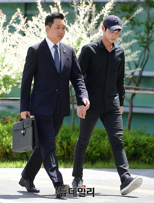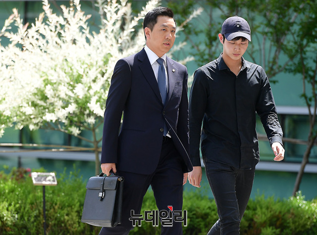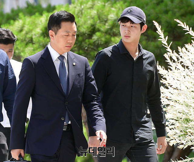배우 이서원이 24일 오후 서울 송파구 동부지방검찰청에 변호인과 함께 입장하고 있다. 이서원은 지난달 술자리에 함께 있던 여성 연예인에게 강제로 신체 접촉을 시도하고, 흉기로 협박해 강제추행 및 특수협박 혐의를 받고 있다.
