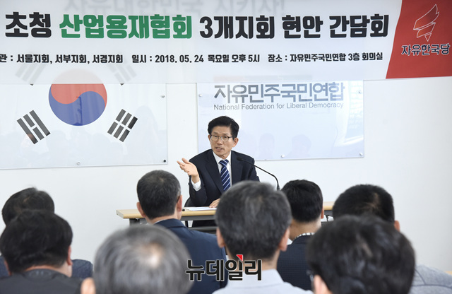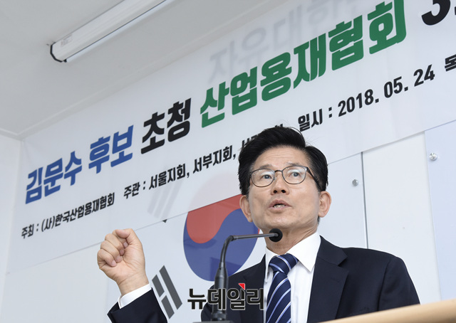 김문수 자유한국당 서울시장 후보가 24일 오후 서울 종로구 자유민주국민연합에서 열린 '산업용재협회 3개지회(서울, 서부, 서경) 현안 간담회'에 참석해 인사말을 하고 있다.