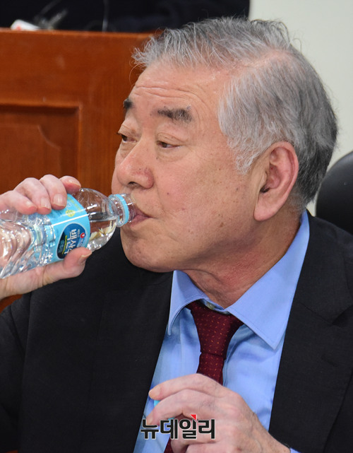문정인 대통령 통일외교안보특보(연세대 명예특임교수)가 25일 오후 국회 의원회관에서 열린 '남북정상회담과 한반도의 미래 남북정상회담의 결과 분석과 남-북-미 관계의 모색' 토론회에서 물을 마시고 있다.