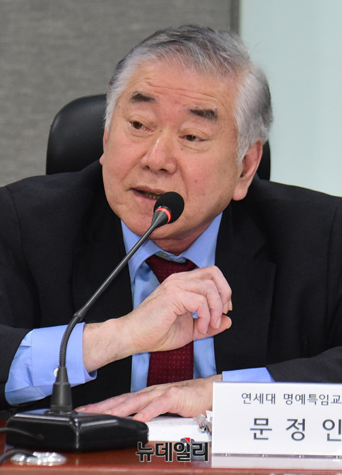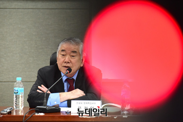 문정인 대통령 통일외교안보특보(연세대 명예특임교수)가 25일 오후 국회 의원회관에서 열린 '남북정상회담과 한반도의 미래 남북정상회담의 결과 분석과 남-북-미 관계의 모색' 토론회에서 발언을 하고 있다.