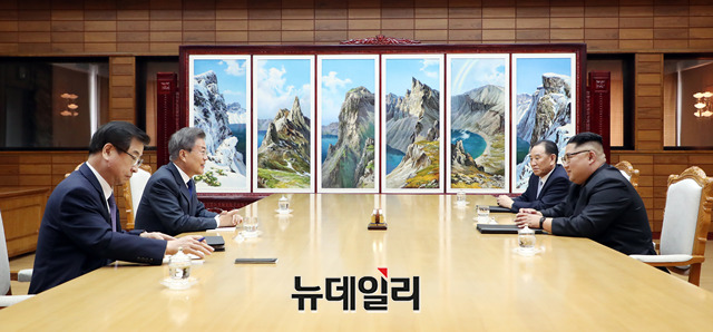 문재인 대통령과 북한 김정은이 26일 오후 판문점 북측 통일각에서 두번째 남북정상회담을 열고 기념촬영을 하고 있다. (사진=청와대)