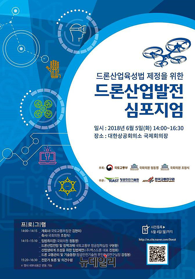 대한민국 드론산업육성법 제정을 위한 ‘드론산업발전 심포지엄’이 6월 5일(화) 14시 대한상공회의소 국제회의장에서 국토교통부, 정동영 국회의원, 조정식 국회의원 공동주최로 개최 될 예정이다.
