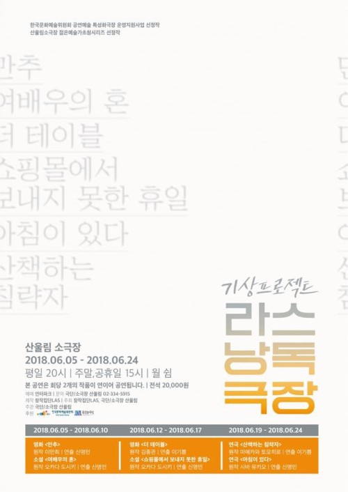 창작집단 LAS는 낭독극의 형식에 영상, 조명, 라이브 연주 등을 활용한 입체낭독극으로 6월 5일부터 24일까지 총 6편을 하루 2작품씩 산울림 소극장 무대에 올린다.