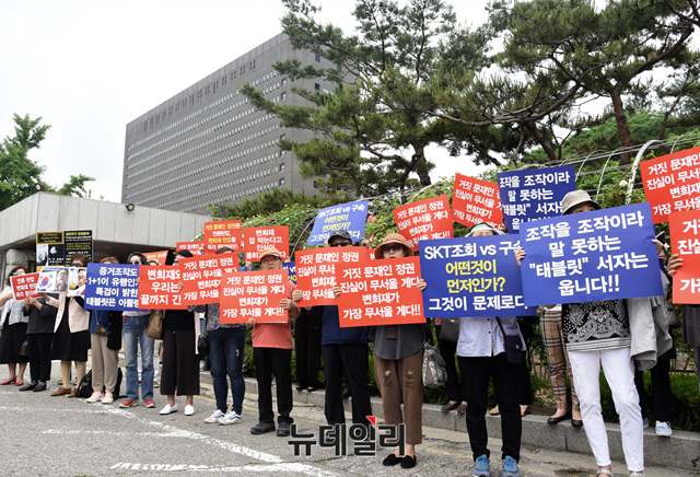 미디어워치 독자모임 한 회원이 29일 오전 서울중앙지방법원 앞에서 열린 '변희재 대표고문 구속영장 청구 규탄 기자회견'에 참석해 태블릿PC 조작 퍼포먼스를 하고 있다.