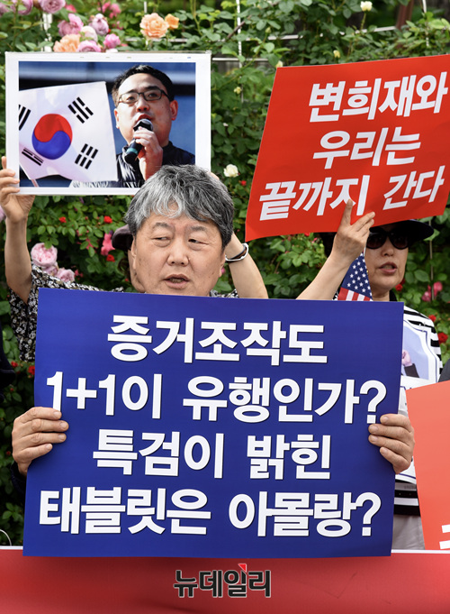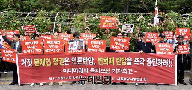 미디어워치 독자모임 회원들이 29일 오전 서울중앙지방법원 앞에서 변희재 대표고문에 대한 구속영장 청구를 규탄하는 기자회견을 하고 있다.