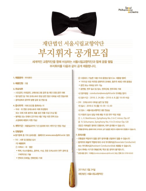 서울시립교향악단(대표이사 강은경, 이하 서울시향)이 부지휘자 공개 모집에 나선다.서울시향은 지난해 9월 최수열 전 부지휘자가 부산시향 상임지휘자로 취임하게 되면서 공석이 된 부지휘자 선정을 위해 공개채용을 진행한다.모집인원은 2명이며, 합격자의 예술적 역량에 따라 수석부지휘자급 또는 부지휘자급으로 채용할 예정이다. 지원 자격은 국내외 전문 오케스트라 유경험자이거나 국제 지휘 콩쿠르 최종 결선 진출 이상의 경력이 있어야 한다.부지휘자는 서울시향의 시민공연과 교육공연 등을 지휘하고, 정기공연 리허설 사전 연습지휘, 음악감독의 음악적 방향 공유 등 서울시향의 음악활동 전반에 참여하게 된다. 임기는 1년이며, 성과에 따라 계약연장할 수 있다.서울시향은 내외부 인사로 구성된 부지휘자 선정위원회를 구성해 1차로 서류와 지휘 영상 심사, 2차로 오케스트라 리허설 실연 심사를 거쳐 최종 합격자를 선정한다. 이력서와 지휘 영상은 6월 8일 오후 6시까지 이메일(conductor@seoulphil.or.kr)로 접수하면 된다.강은경 서울시향 대표이사는 "다양한 층위의 역량 있는 차세대 지휘자 확보를 통해 국내 음악계의 고질적 취약 분야인 지휘자 군의 역량을 강화하고, 클래식의 저변을 확대해나갈 계획"이라고 밝혔다.