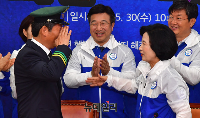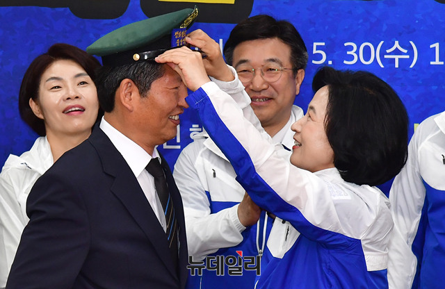 추미애 더불어민주당 대표가 30일 오전 국회에서 당대표실에서 열린 6.13 지방선거 '평화철도 111 유세단' 출정식에서 정청래 전 의원에게 모자를 씌워주고 있다.
