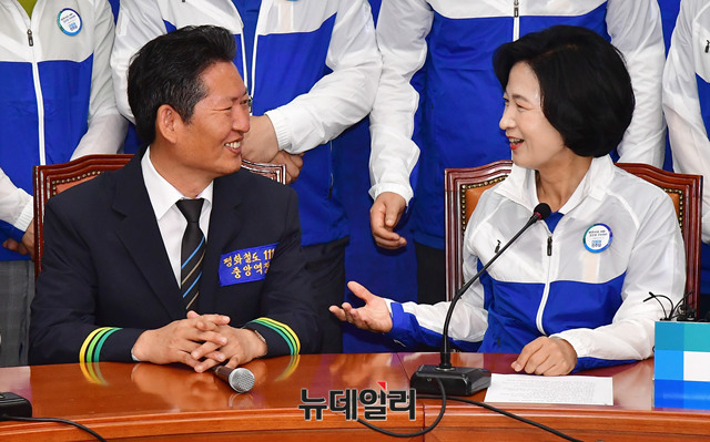 [포토] 정청래 전 의원 모자 씌워주는 추미애 대표